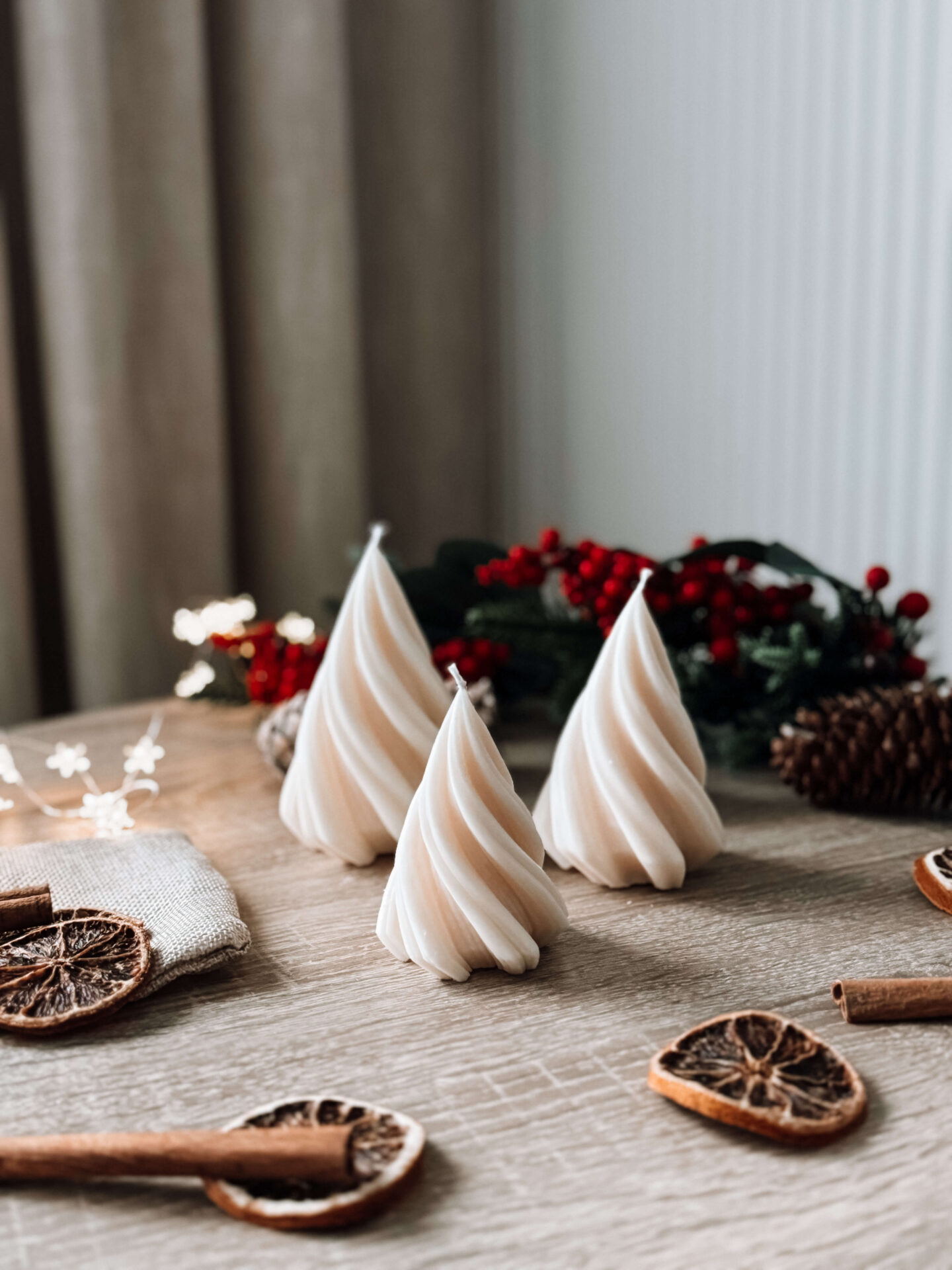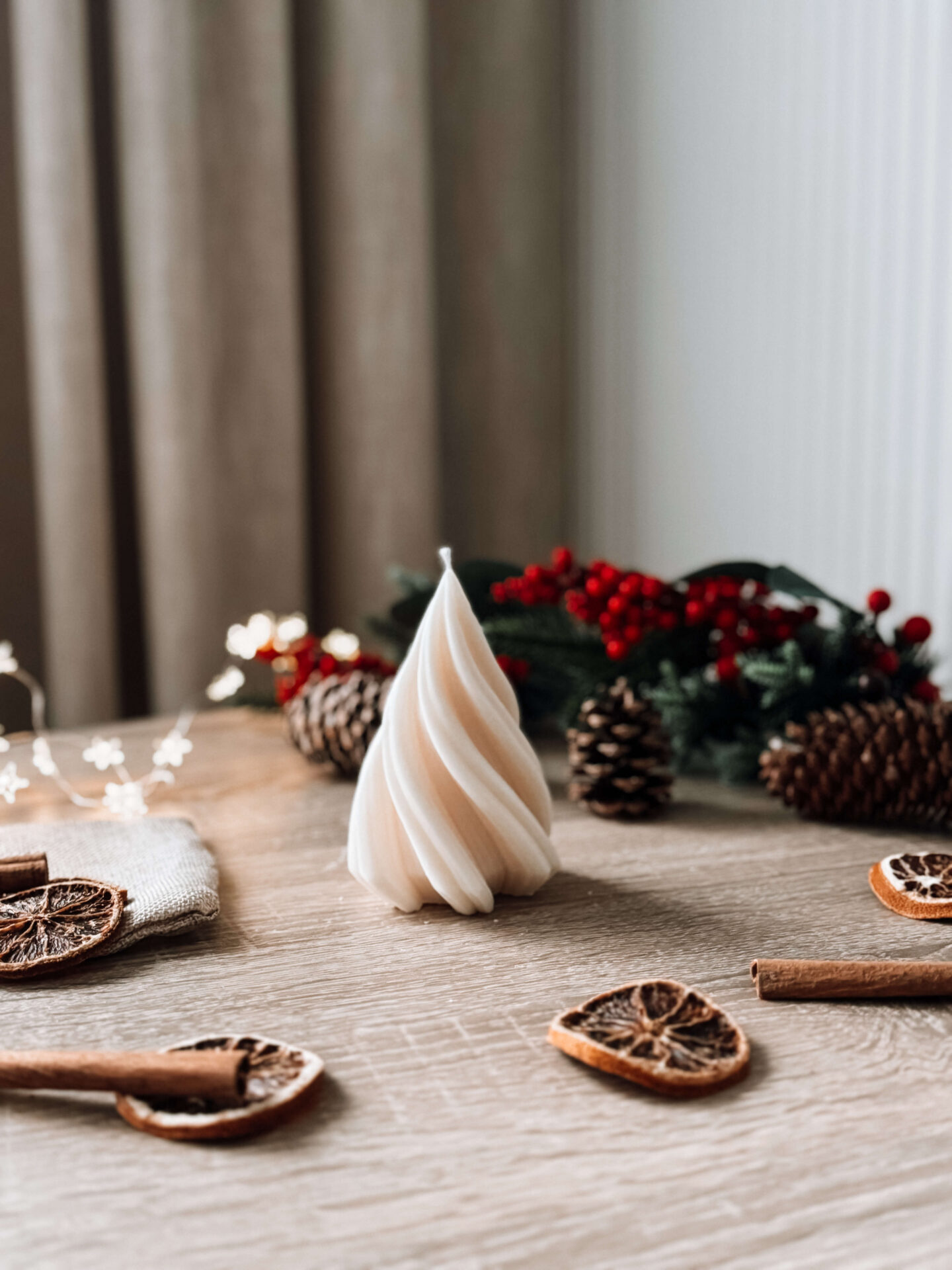 Ta świeca, stylizowana na kręconą choinkę, to elegancka propozycja dla tych, którzy lubią połączenie prostoty z nutką świątecznej tradycji. Jej smukły, kręcony kształt przyciąga wzrok, a naturalny wosk sojowy wypełnia przestrzeń delikatnym, ciepłym światłem. Idealna na wieczory przy blasku lampek i kominka.